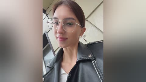 ewabrown - Video of a young woman with light skin, brown hair, and green eyes, wearing clear glasses and a black leather jacket over a white top, indoors against a beige wall.